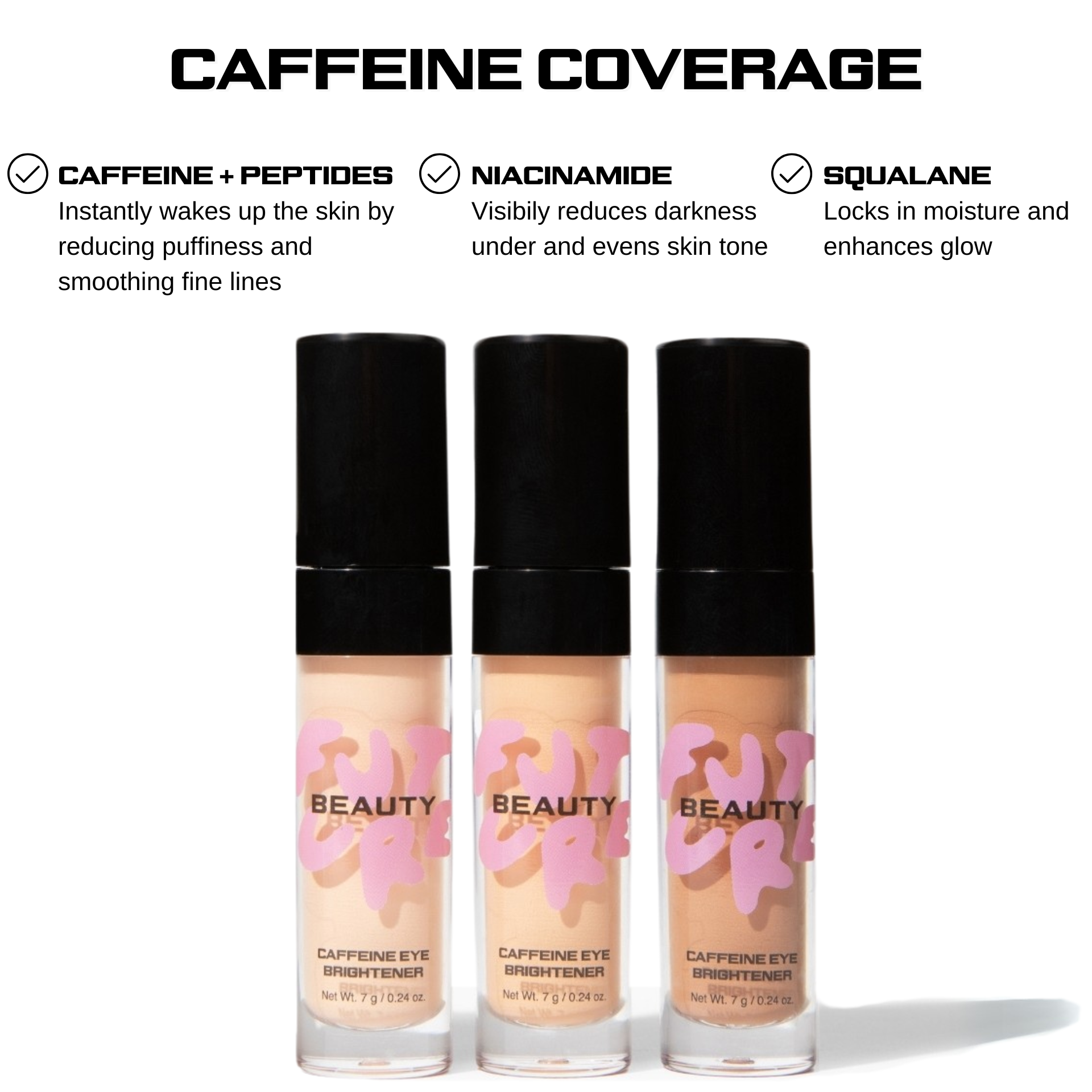 - Visibly reduces puffiness + dark circles (Caffeine)